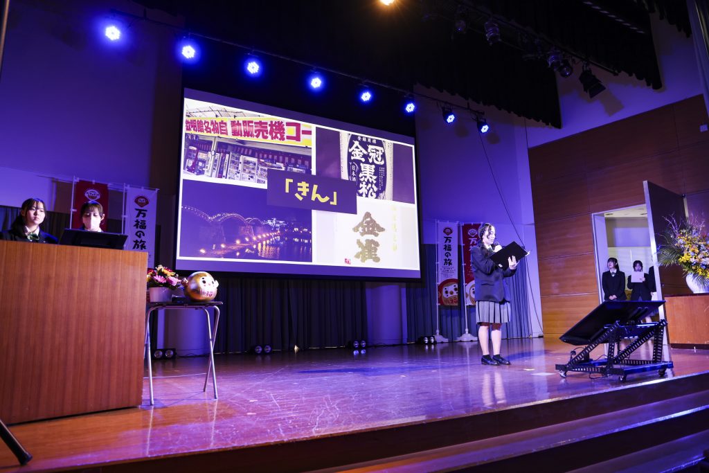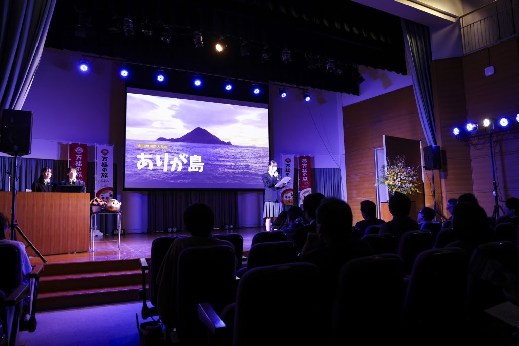 本フォーラムは、今年度当初から約半年間にわたり取り組んできた、山口県の「若者活躍による観光力パワーアップ事業」の集大成として実施されたものです。当日は、2年次生8名が『つい、立ち止まる岩国』をテーマに、岩国市のレトロなスポットや周防大島町でのアクティビティ体験について発表しました。