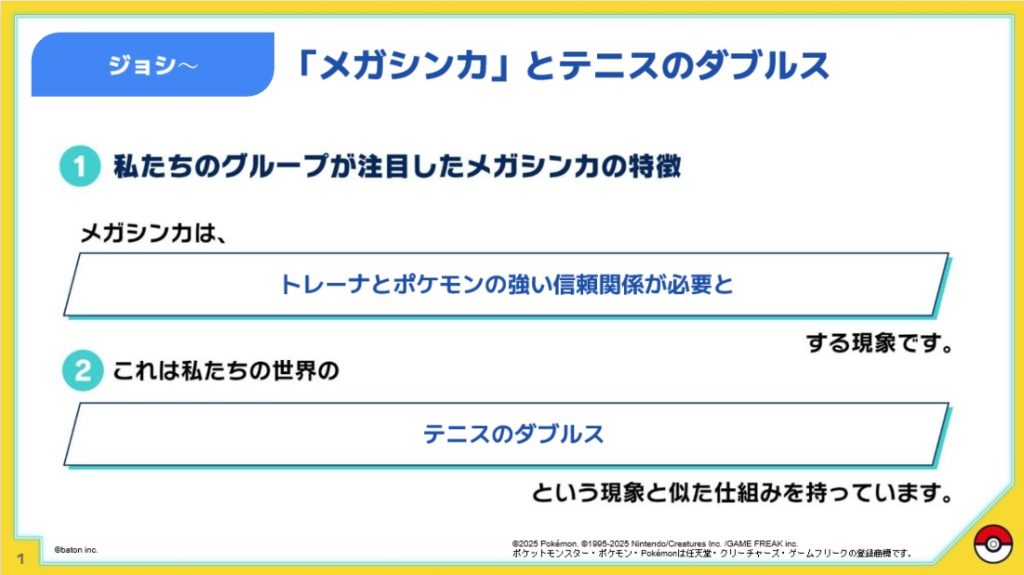 探究Knock(https://tankyu.baton8.com/)が提供している教材を使い、「ポケモン」の世界を舞台にした探究学習に取り組みました。題材はポケモンの「メガシンカ」。生徒たちは「メガシンカ」を現実世界の現象とつなげながら、自分たちの「見方」でメガシンカを再解釈しました。